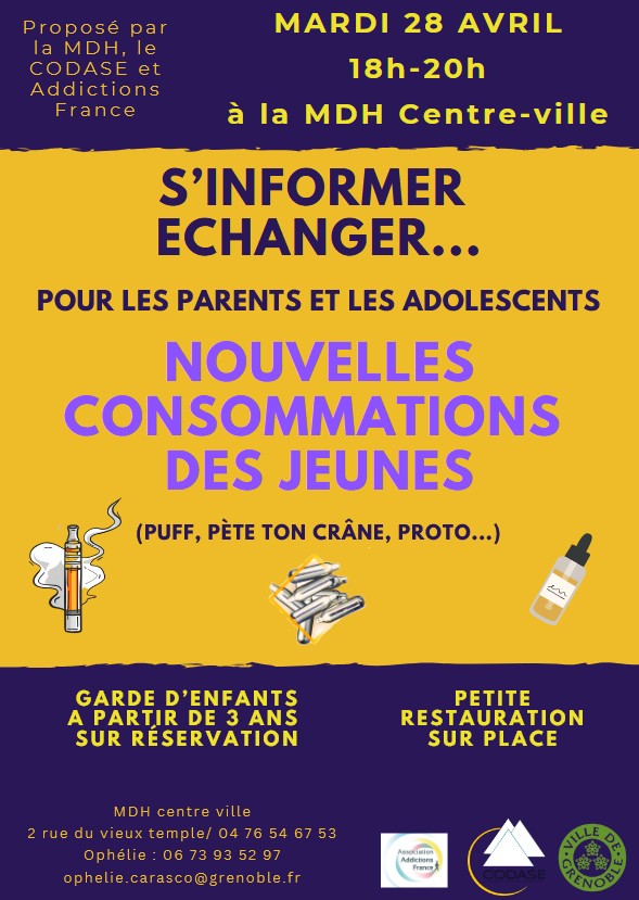 Le MARDI 28 avril de 18h à 20h, la MDH centre ville (2 rue du vieux temple) propose aux parents et aux jeunes une soirée avec un professionnel de France addiction et 2 éducatrices de prévention du CODASE pour un temps d'informations et d'échanges sur les consommations à risque chez les jeunes :