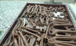 Moulage, démoulage, chauffage des pièces et naissance de tenailles, clés à mollette, écrous et boulons, tout pour la future boite à outils en chocolat qui sera mise en vente pour la fête des pères.